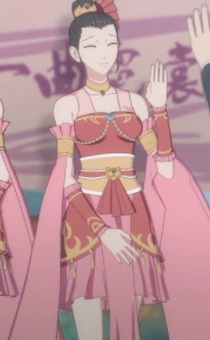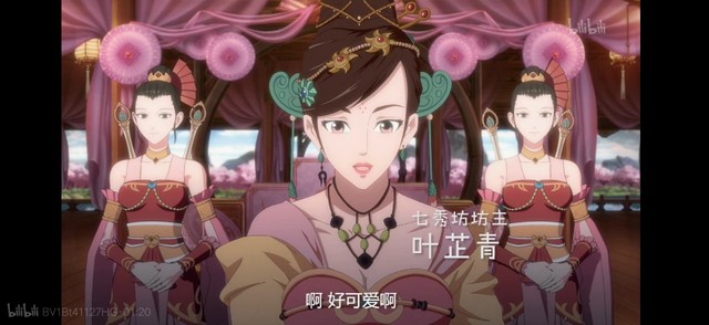 作者七秀弟子是一身粉,金色头饰,丸子头,有妆容,手拿双剑