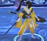 作者姐姐武林新秀藏剑弟子梳马尾、右边有刘海,衣服是黄黑相间的,护臂和下身是白色,手拿轻重双剑