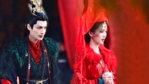 随着时间,二人中间牵着一个红绣球缓缓走来。