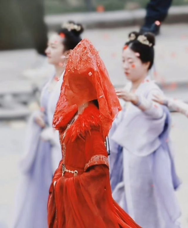 公冶沁毓登上右边的台阶,萧云谏踏上左边的台阶,二人中间牵着一个红色丝绸的红花朝着大殿一步步走去。