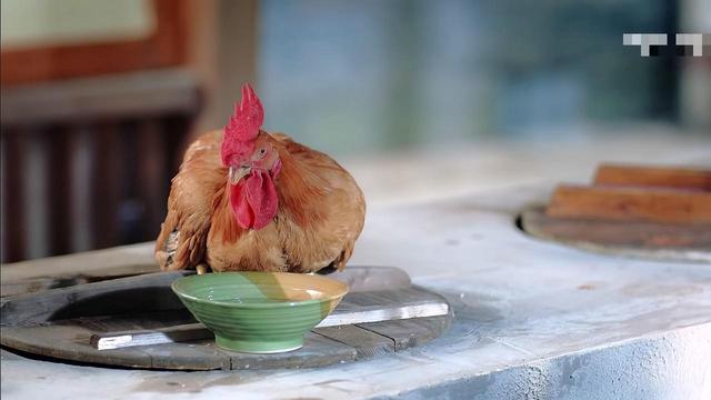 只见他高高的举起菜刀,做好心里准备,紧闭双眼,“咣”一声菜刀落下了,然后并没有落到鸡身上,落在了案板上。