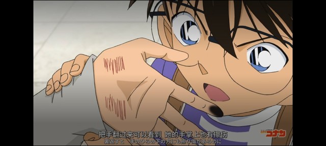江户川柯南把手翻过来看的话,她的手掌上也有擦伤