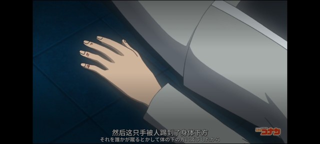 江户川柯南而昨晚摆出这个姿势的百崎警官,应该是被凶手发现了,然后手就被踢了回去