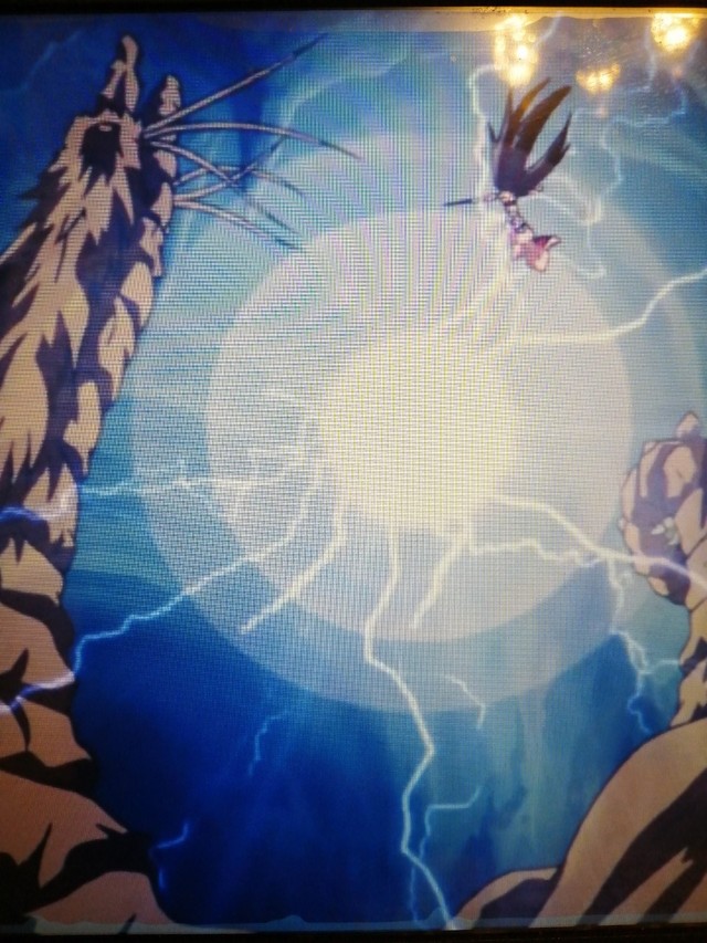 翠子手拿宝剑,冷眼看着面前的妖怪,而妖怪也转变了方向,不再执着于桔梗,向桔梗冲了过去,而翠子一剑向妖怪斩去,白色剑气将妖怪斩断,而后,在翠子与妖怪中间出现一如白昼,且周围带着电流的光球——