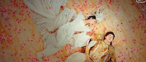 润玉与旭凤打斗了起来,只看见旭凤两只手上,熠熠生辉的两朵红莲绽放着。红莲上燃着紫红色的火花。而润玉则打出了灭日冰凌,冰凌寒气逼人,蓄势待发。二人使出了全力,向“敌”打去。灭日冰凌如箭一般都飞出去,而红莲业火则消失殆尽。润玉见状,十分不理解,却又来不及收回灵力了。一道道灭日冰凌穿过旭凤的琵琶骨,局面平稳下来后,只见锦觅握着冰刃刺进了旭凤的胸膛,如此,润玉便知道红莲业火熄灭的原因了。