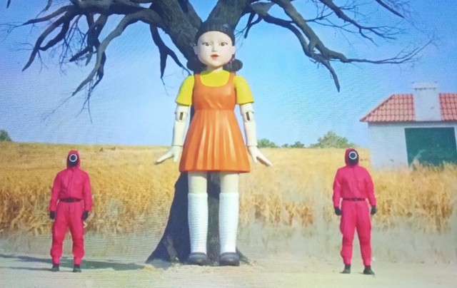 树下的大型玩具木偶人,转过去自己的身子。电子女声:“在鬼说,一二三木头人,的时间内,各位可以往前移动。之后若被侦测到移动,就算淘汰。”