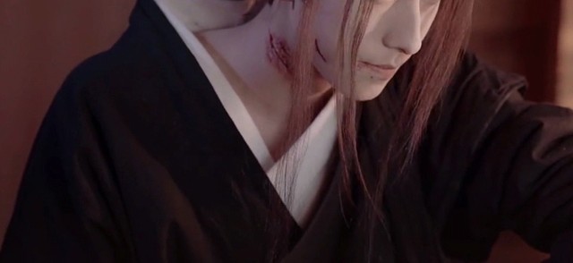 少年身着墨色的缎子衣袍,袍内露出银色镂空木槿花的镶边;所显露出来的肌肤;是布满血迹的伤口;挽起一截衣袍;将受伤的部位包扎止住血。