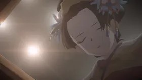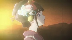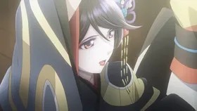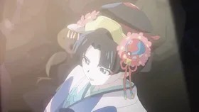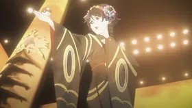 烟雾散尽,一轮金色的日光升起,一位紫色和服女孩舞动着扇子出现。