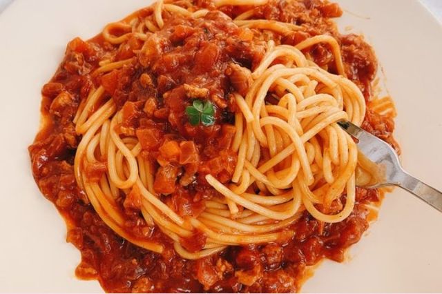 大家都开动了,冬咏吃了口番茄肉酱意面