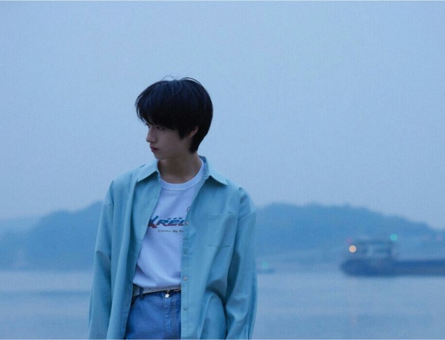 朱志鑫穿着青蓝色的外衣站在她面前,好像与大海青天融为一体。