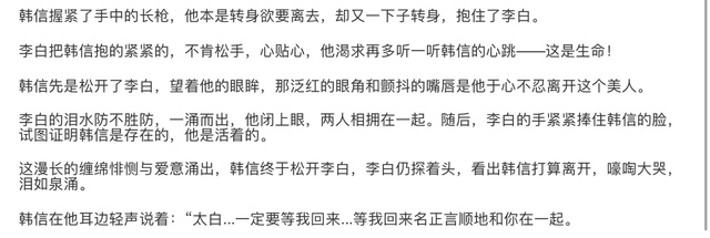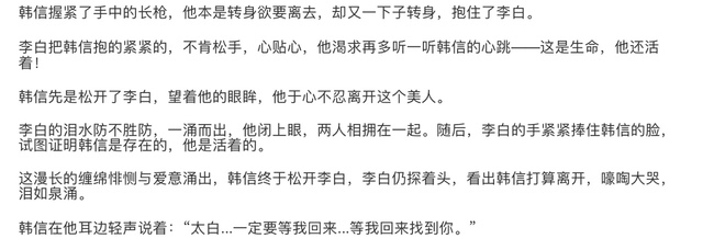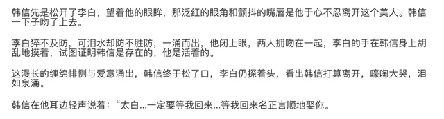 韩信在他耳边轻声说着:“太白...一定要等我回来...等我回来找到你。”