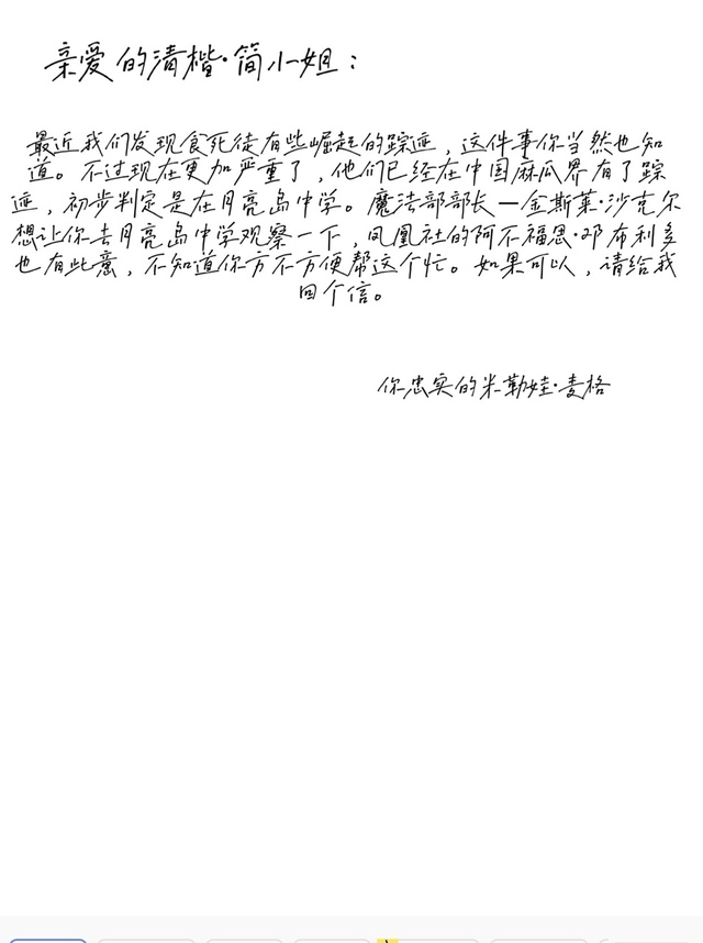 简清楷看到了天上有一只猫头鹰,它脚上还有一封信