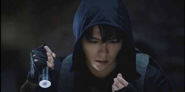 男子穿着一套黑色的衣服,甚至他头上也带着帽子,这个帽子是和衣服连在一起的。
