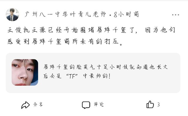 玖辞大大虽然说我不知道你们为什么要黑他们,从众也好,别人促使也好,但请你们换位思考一下,你们也有你们喜欢的偶像爱豆不是吗?若是其他人黑你们的偶像,你们不会生气吗?像王一博,易烊千玺,王俊凯,黄子韬,华晨宇,肖战,杨超越,关晓彤,王源,迪丽热巴,他们都很好!他们都很努力,很优秀,他们都很谦逊有礼,并且都是实力派的偶像,他们也是很辛苦的