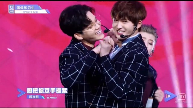 屏幕上朱正廷和周彦辰面对面十指相握,笑着唱完了这一句,又马上分开。