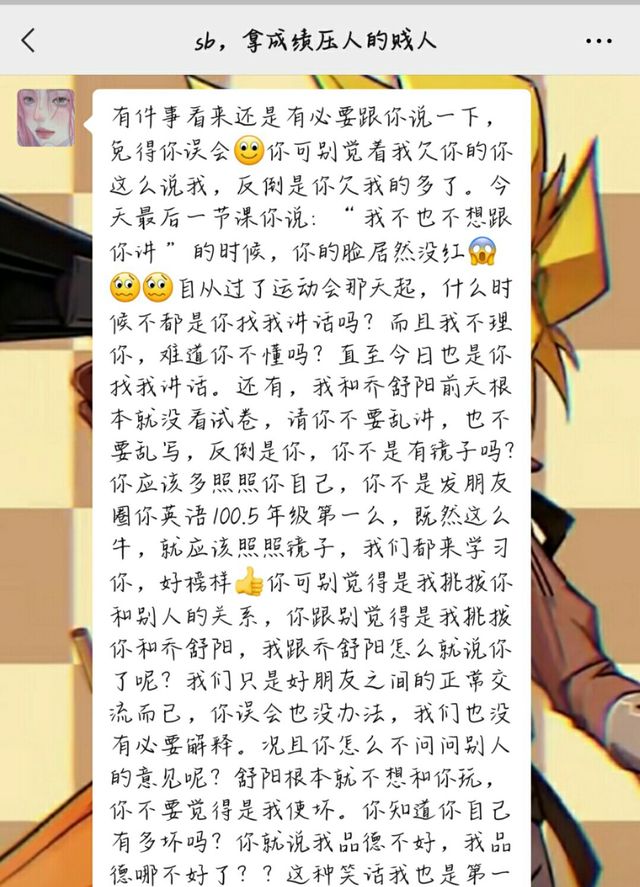 码字人运动会那天本来就是你跑,你什么事都没有就让我代跑。现在我有事先走了,你还反过来骂我?有没有一点自知之明?你以为数学比我好,还是班长,就可以拿成绩压人了?人品不好 ,要成绩有什么用?你自己也好不到哪里去,仗着自己班长的身份来找同学来孤立我。啧啧啧,你可真是个好班长,给你鼓鼓掌啊👏👏👏优秀