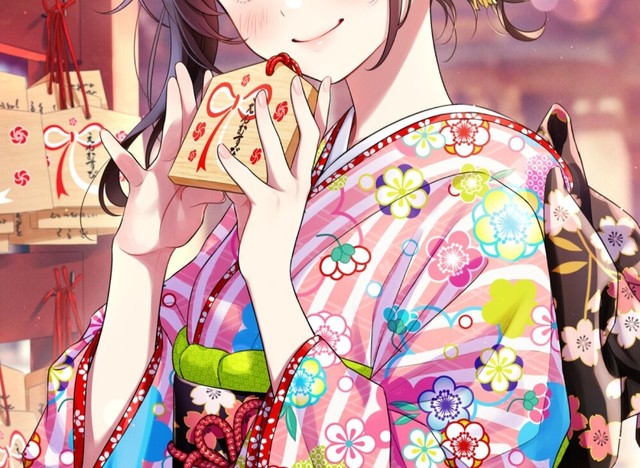 女孩穿着樱粉色的和服十分俏皮,头发盘起来,脸上洋溢的笑容