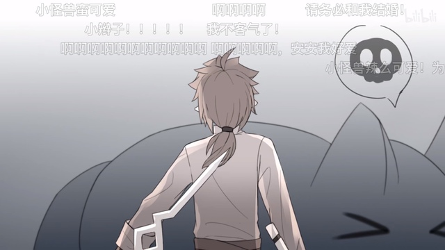 画面一转,只见屏幕上的安迷修一只手在前面,一只手在后面,保护“我”不被怪弄伤。