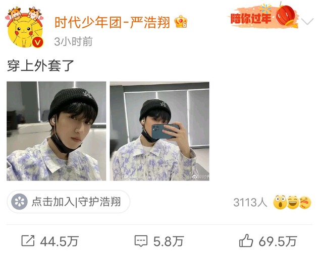 严浩翔穿上外套了。
