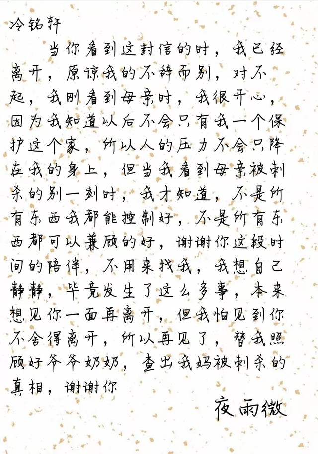冷铭轩对,因为当天晚上雨微给她母亲一块丝巾,而今天早上却不见了,说明什么
