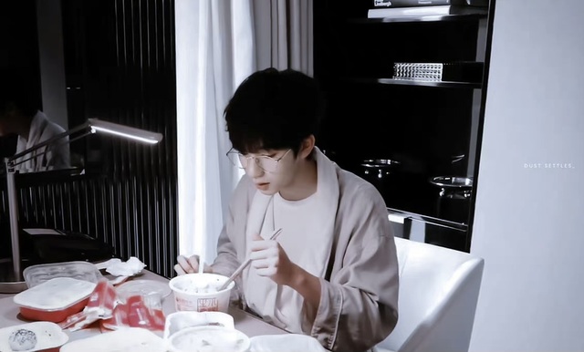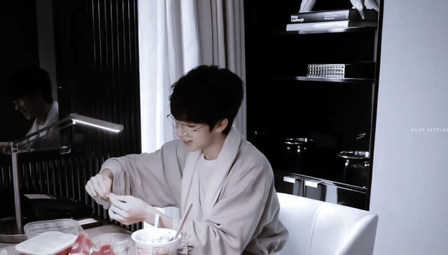 助理把外卖分给工作人员,贺峻霖也坐下来吃刚刚没吃完的饭,还顺便帮郁栀开好了包装。