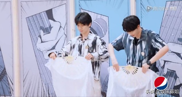 两个人一会把扇子两只手抛着玩,一会故意扮丑做出搞怪的动作,把陈曦逗得前仰后合。