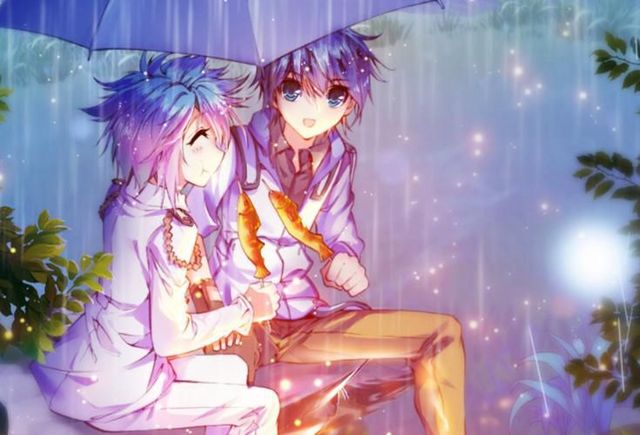 两个少年笑着,吃着手中金黄色的烤鱼,在雨中相视而笑。