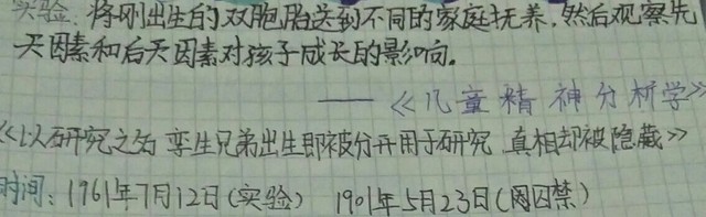 很久之前曾经有过一个实验,这个实验启动于1961年7月12日,这个实验是从《儿童精神分析学》当中提出来的:将刚出生的双胞胎送到不同的家庭抚养长大,观察先天因素和后天因素对孩子成长的影响。“跟他们也不符合吧?”“对呀,的确不太符合。”“谁说一定要在不同的家庭生长才能观察?不可能因为缺少一个条件,实验就不开始。”