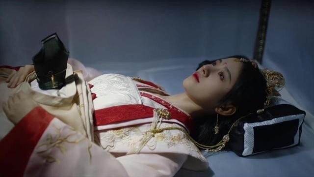 一位女子躺在里面,穿着嫁衣,面容安详,仿佛这是睡着了