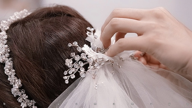 林梦日坐在镜子前 笑笑 头发被挽起 盘在发顶漏出纤长的脖颈 化妆师拿起头纱往上别 她真的把这套高价婚纱穿出了它的价值。
