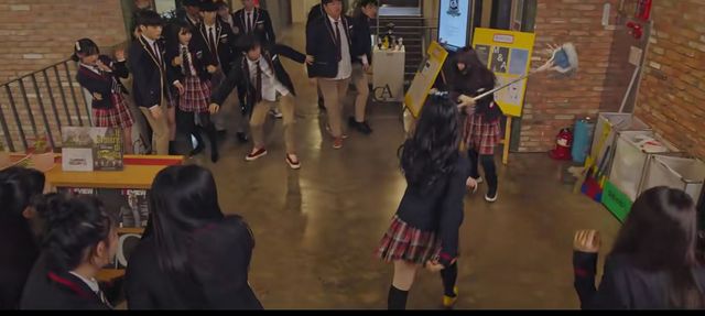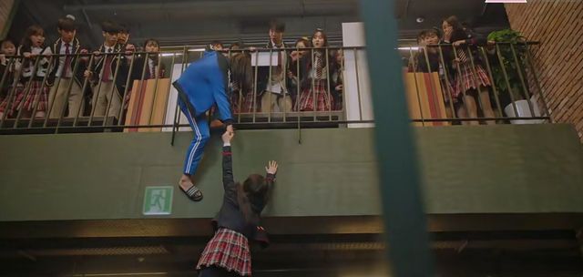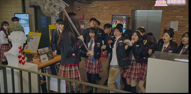 露娜一把推开敏赫,将拖地的水洒在他们身上跑出去,同学们在后面穷追不舍,露娜被他们追到栏杆边拿起拖把自卫
