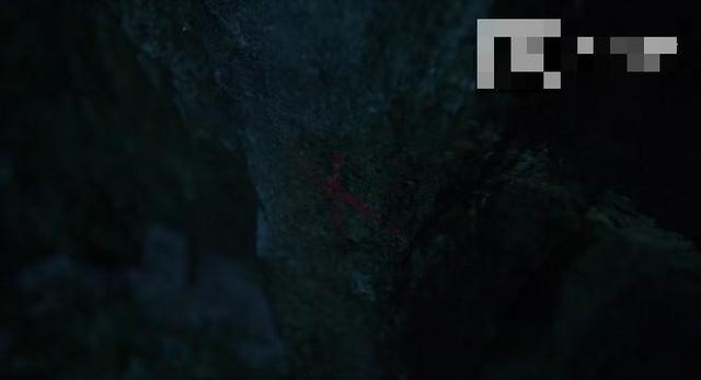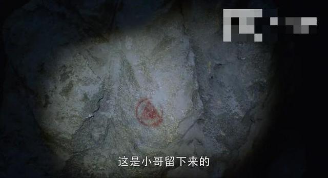 阿宁和江子算站在一起,阿宁缓缓后退,在石壁上用口红留下了一个记号,给吴邪提示
