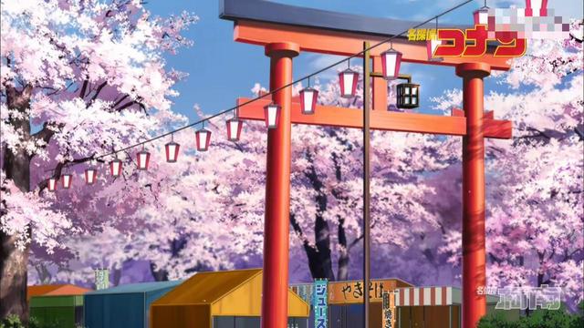阿笠博士和少年侦探团几个人正好趁着樱花盛开时到神社游玩野餐。