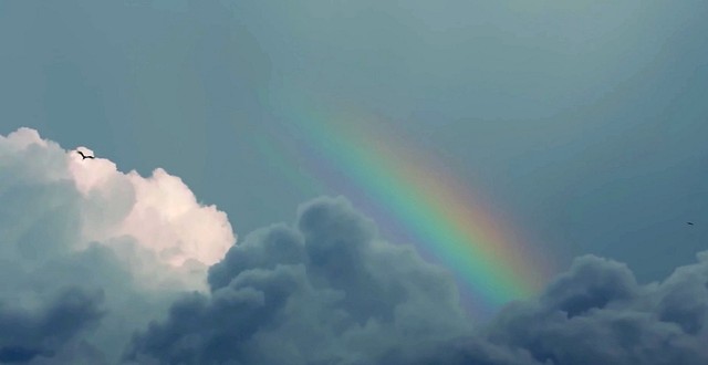 雨过天霁,蔚蓝色的天空中出现一道色彩斑斓的彩虹,洁白如棉花的云朵随风轻轻飘动,风光无限美好。