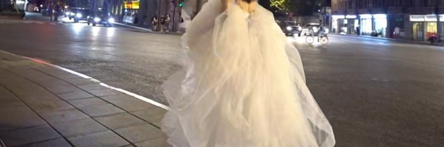 在天色渐暗的马路上宋亚轩牵着唐雪的手唐雪提着婚纱跑,后面全是粉丝和记者在拍照