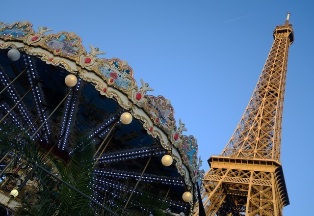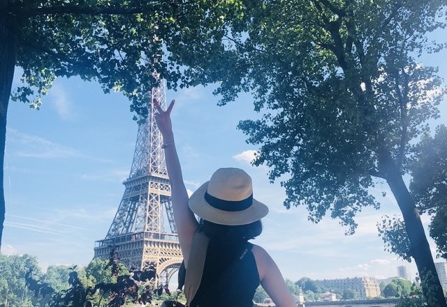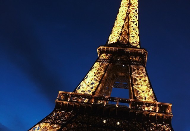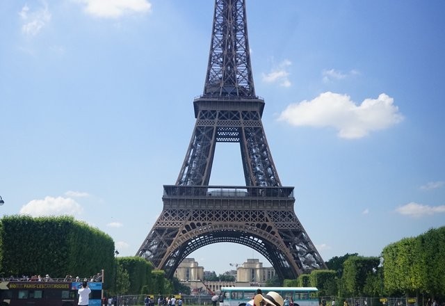 两个人吃完饭后,来到了巴黎铁塔。不远处就可以看到这个浪漫的建筑物。