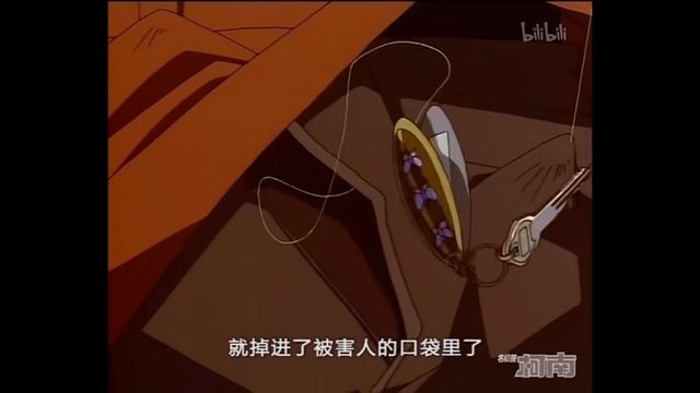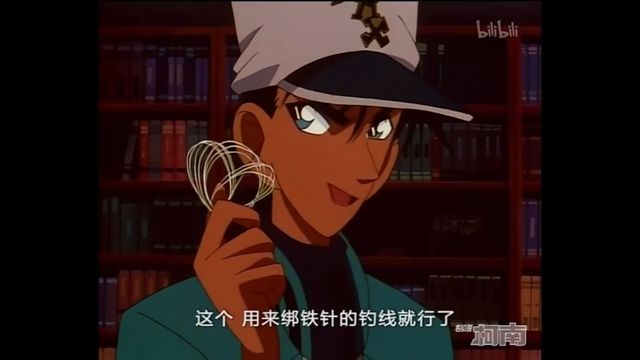 服部平次然后把绑上铁针的一端塞进被害人的口袋里,将钓线从中通过