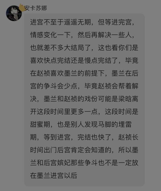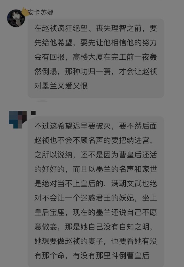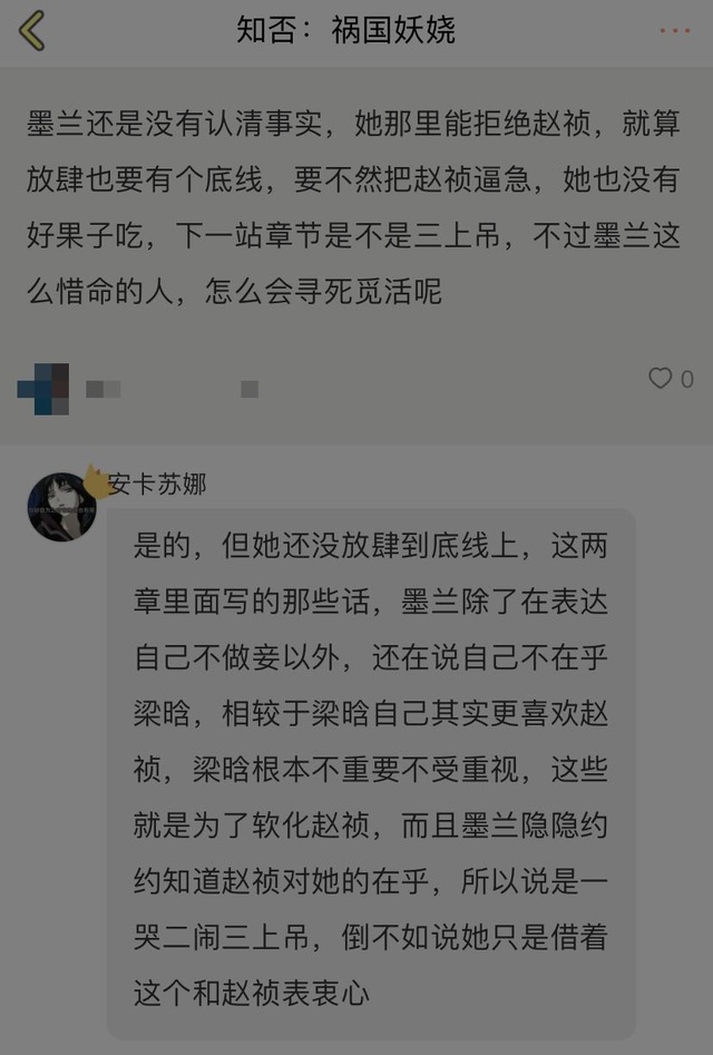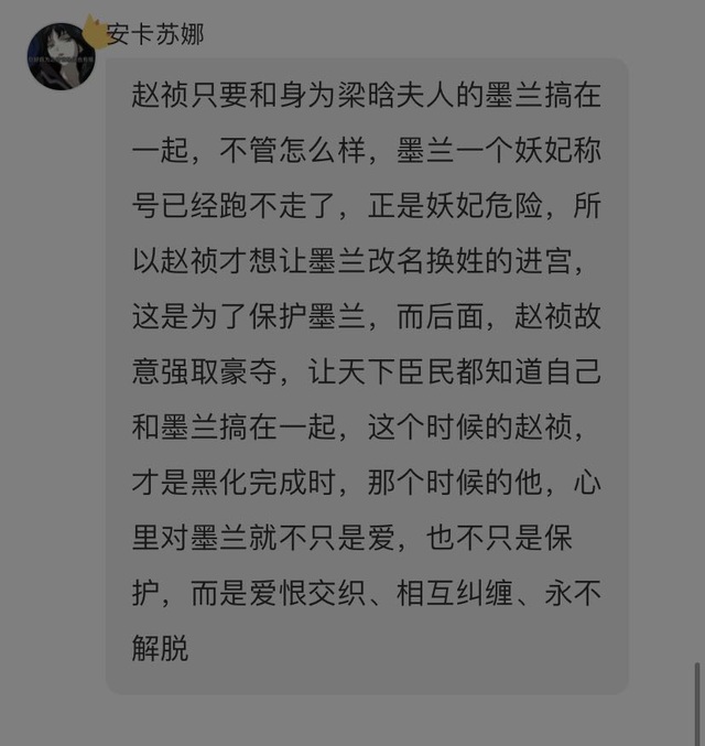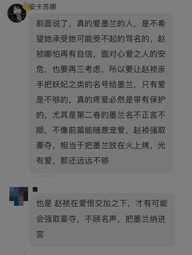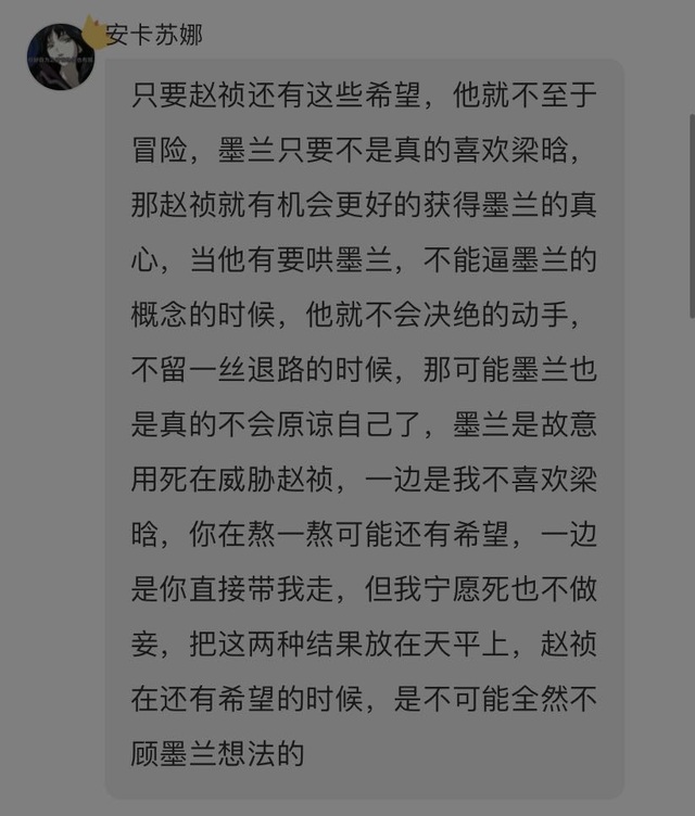 作者墨兰对梁晗是有些好感的,但她不敢说,赵祯的选择其实就是逃避,反正先把梁晗搞走,之后再和墨兰二人世界,不信她不和自己私奔之类的,反正等梁晗走了,他还有大把时间和墨兰商量他们的事,还有很多机会让墨兰相信自己啥啥的,反正就是他心里还抱有美好幻想