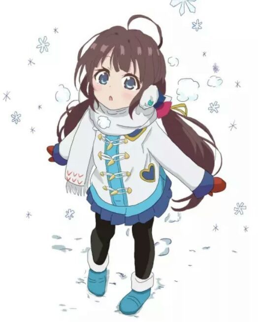 耳朵上带着两个白色的耳罩,脖子里带着云朵图形的围巾,外面穿白色羽绒服,里面搭配蓝色针织毛衣,手上带着深红色的手套,下身是深蓝色的百褶裙和黑色长筒裤袜,脚上穿着白色绒毛的蓝色短靴。