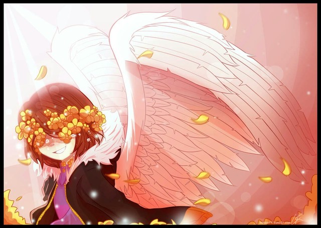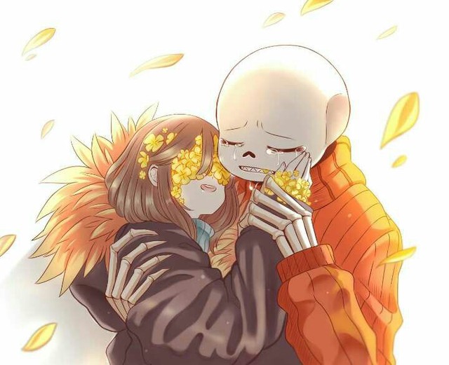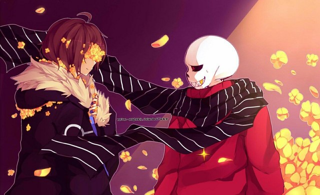 话音刚落,天空中又飘出了几朵金色的花。而sans怀中的frisk,也不见了踪影