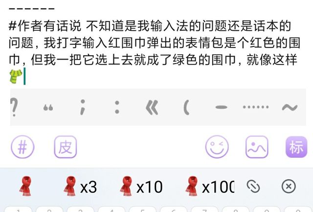 作者有话说不知道是我输入法的问题还是话本的问题,我打字输入红围巾弹出的表情包是个红色的围巾,但我一把它选上去就成了绿色的围巾,就像这样🧣!😂😂😂