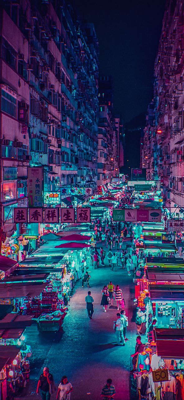 道路周围立有居民楼区,层层叠叠,像一个个方盒子一样堆叠在一起,闪烁着的霓虹灯光让这里显得很狭窄,黑色数据长线穿梭在居民楼建筑周边,不远处还有一条条光带;除此之外,还有一个个商铺小摊,贩卖的东西多为各种小吃,食物的香气在周围扩散。这里应该是小集市