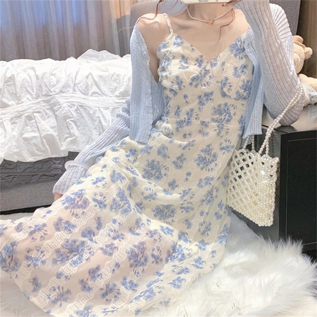 换上衣服的你一照镜子,也是不免感叹这身衣服,蓝色碎花吊带,小V领的设计增添了小性感,露背的处理也很好的凸显你光洁白皙的后背,腰线的处理也让赘肉无处可藏,下摆的网纱看得到修长的腿,内衬竟然只到大腿中部,一定是内衬的布料不够了吧?