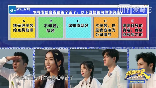 李晨老板的青睐,看题目回答问题,每道题五个答案,每选应对不同的赛道和旗子,回答正确的成员会受到老板的青睐