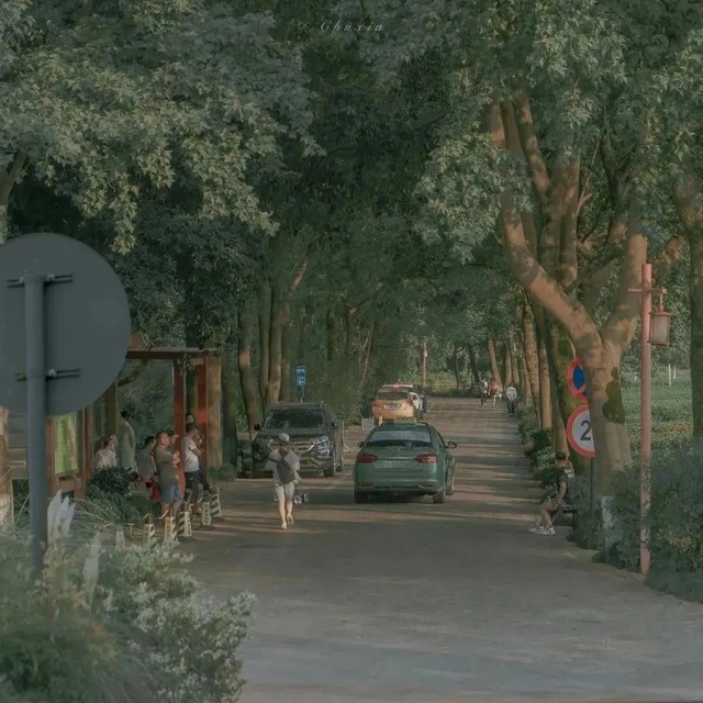 人行道上的梧桐树叶子被清洗地青翠欲滴,树干上的白色油漆和黑色树皮颜色更加分明。