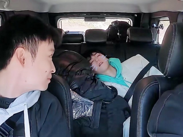 等到子健叔再次往后座看时,小凯哥已经趴在中间的衣服上睡着了。