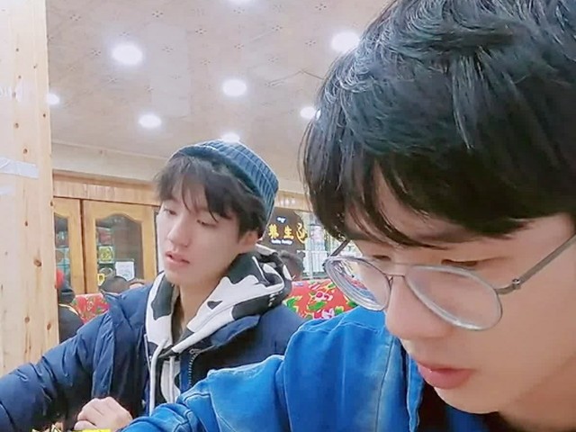 子健叔指指昊然哥,昊然哥还在低头干饭,浑然不知。