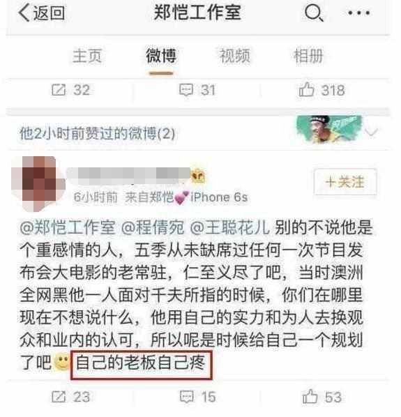 郑恺因被撕名牌录制现场大发脾气的新闻,被“全网黑”。而在郑恺面对千夫所指时,节目组为了热度没为他做任何弄清。往后有一位郑恺粉丝为节目组对郑恺的不公抱不平, 发微博称:其时澳洲全网黑他一人面对千夫所指的时分,节目组在哪里现在不想说什么,他用自己的实力和为人去换观众和业界的认可,所以是时分给自己一个计划了吧,自己的老板自己疼。并@了郑恺工作室。往后郑恺工作室公开点赞此微博,疑似要正面撕节目组。
