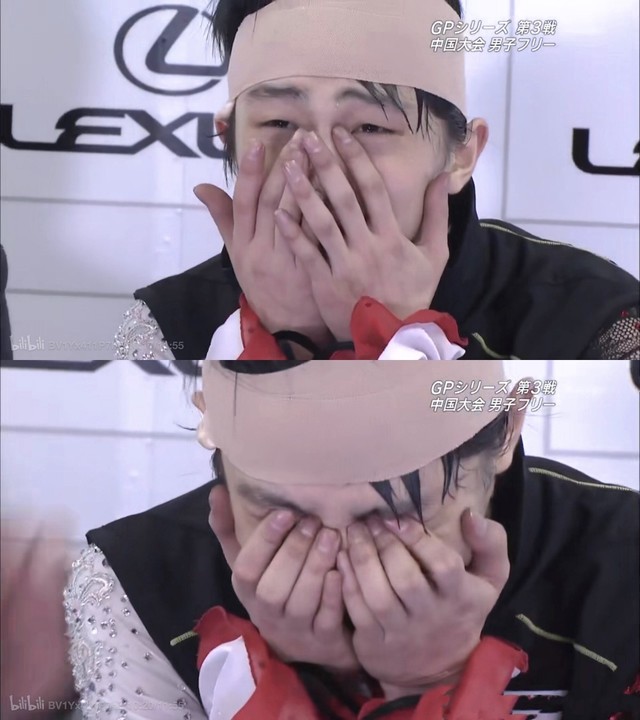 当播报员说出rank(排名)2时,羽生难以置信地看了看旁边的奥瑟,而后用擦过下巴的纸掩面哭泣