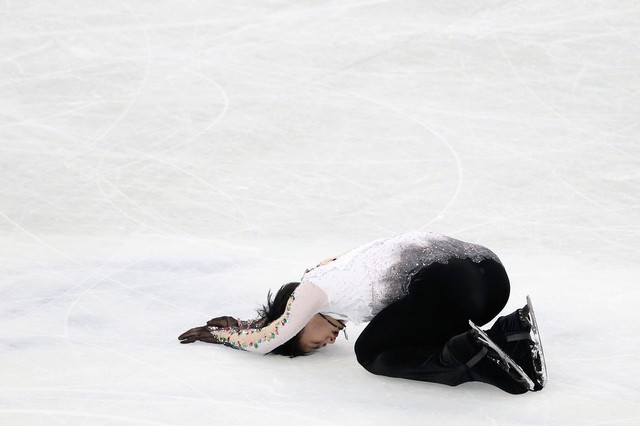 羽生望向看台四周,微微一笑,眼神中充满了力量。他照例的弯下身摸了摸冰面,可是因为腹部缠了绷带,这个动作略显笨拙,起身的那一刻,舒晴看到了他脸上难忍疼痛的痛苦。